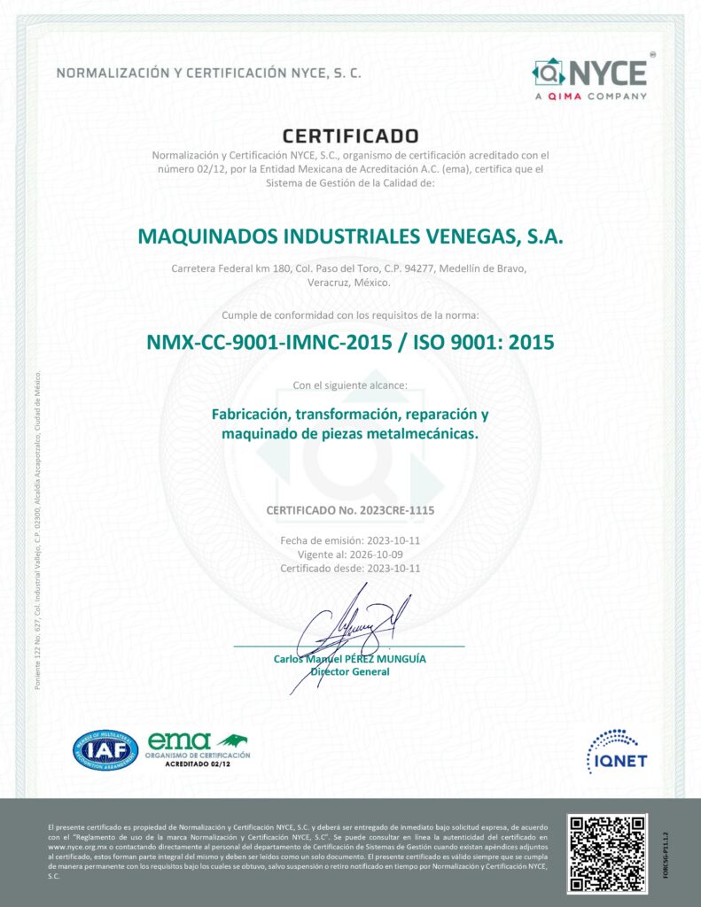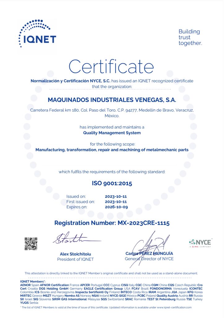 El personal de MAQUINADOS INDUSTRIALES VENEGAS S.A. de C.V., estamos comprometidos a fabricar, maquinar y reparar piezas metalmecánicas del sector industrial, utilizando maquinas-herramientas: convencionales, CNC, instrumentos de medición y soldadura, cumpliendo con las necesidades y expectativas de nuestros clientes, apegándonos estrictamente a normas obligatorias, dimensiones requeridas, y especificación o plano.